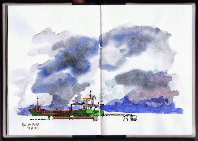 Há algum tempo que não passava pela zona do Poço do Bispo para um desenho à beira rio. Estava lá atracado um barco um barco que ainda não tinha visto por ali e pus-me a jeito para o apanhar do ângulo que pretendia, sentado junto ao pontão.