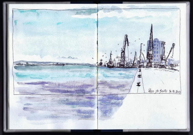 Acima da linha do horizonte sobre o mar pairava uma espécie de neblina que me pareceu um desafio para ser representada, pelo que aproveitei logo para pegar no caderno.