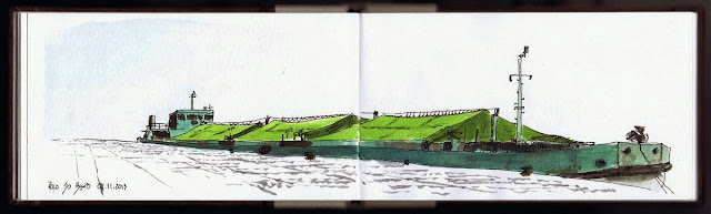 Mais um desenho à beira rio. Já por diversas vezes tinha desenhado partes destas barcas, mas nunca uma na totalidade. Não é fácil encaixá-las no caderno porque são muito compridas, mas o formato que estou a usar actualmente serviu na perfeição.