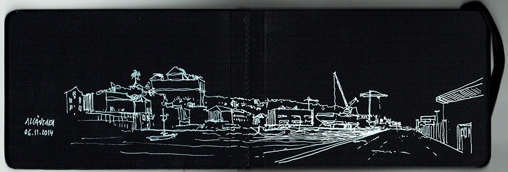 Para a 2ª tentativa no caderno preto dirigi-me ao Porto de Lisboa. Já tinha feito um desenho mais ou menos neste local e estava de certa forma curioso para ver como o resolveria neste caderno.
