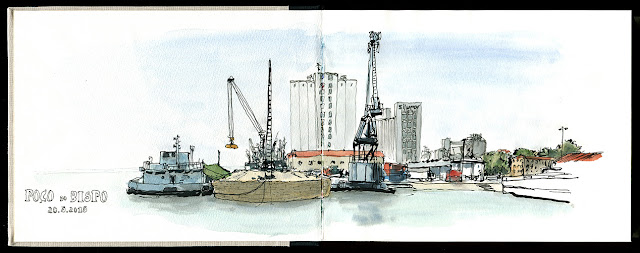 Este é com certeza o cenário presente mais vezes no meu caderno. Já não sei quantas vezes aqui desenhei, em diferentes cadernos e com diferentes materiais. É engraçado este exercício da repetição, mas o receio de estar a desenhá-lo exactamente da mesma forma está sempre presente. Hei-de compilar todos os desenhos feitos aqui para ver se efectivamente são todos muito iguais ou todos muito diferentes.